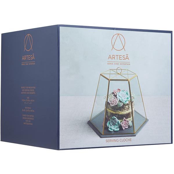 Delicately stacked canapes, smoked fish, cured meats, antipasto, dips, miniature cheesecakes and other sumptuous desserts are often at their best when presented chilled, and this beautiful glass and slate cloche, by Artesà is sure to present your chosen dishes in a suitably decadent style.