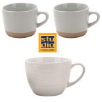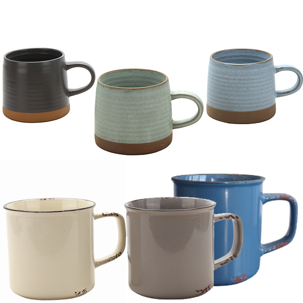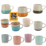 Strong stoneware mugs in modern designs and colors.