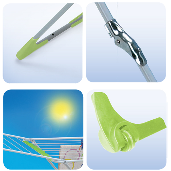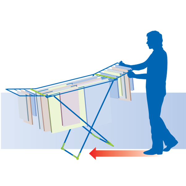 Smart pegless clothes drying frame from Rayen. 18m of clothes hanging space. Firm grip without pegs. No peg marks on the clothes after drying. Criscross grip system. Perfect to any area: Indoors or outdoors. With wheels for easy moving, Safety hinges and feet for greater stability.