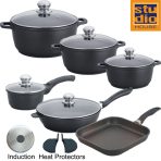 Studio House high quality die-cast non-stick cookware line Domus is the perfect value for money cookware available. Heavy Duty, professional, long lasting quality pressure die-cast aluminium. Thick construction that retains heat well. Perfect flat induction base, energy saving, easy and fast cooking. Top quality long-lasting two-layer interior non-stick coating. Easy clean interior & exterior. Break resistant clear glass lid. Dishwasher safe. Ideal for fat free cooking and healthier diet.